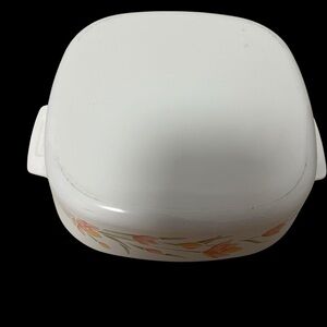Corning Ware Casserole dish with a floral design and glass Pyrex lid. Features pink and orange flowers on a white base. 1987 to 1991 Era. This beautiful Cottagecore piece is so useful for Thanksgiving and family gatherings. The glass lid is substantial.