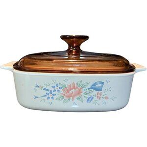 Keywords: vintage casserole, ceramic dish, floral pattern, bird motif, multicolor, Nike, round casserole, dishwasher safe, kitchenware, pre-owned, vintage style, ceramic cookware, serving dish, home decor, kitchen accessory.