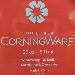 Corningware Red Meal Mug with Plastic Vented Lid. Red Ribbed Soup Mug with Cover. Excellent pre-owned condition, perhaps unused. 20 ounce, 4" tall without the lid, 4.75" wide.