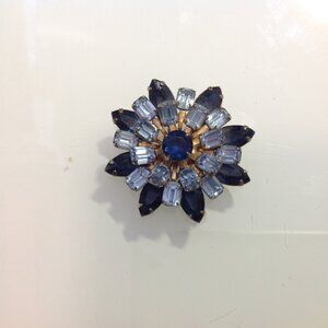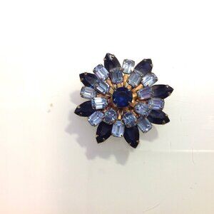 Signed Coro Brooch 1940s or so. Vintage. Azure and Cobalt Blue crystals on gold back. Signed Coco in rear brace. Shape of Sunburst, starburst , star of snowflake, you get the deal. Diameter 1.67" or 42.6 mm. Excellent condition.