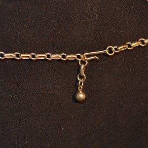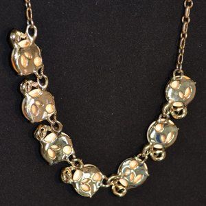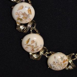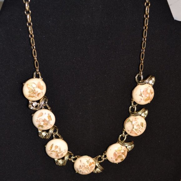 NECKLACE - Bright gold tone base, adorned with rhinestones is the setting for 7 creamy white Lucite with gold confetti cabochons. Each Lucite gem is 5/8 inches in diameter - the cabochon portion measures 7 inches, with a 9 inches of gold link chain and a open hook clasp - so you can adjust the size.