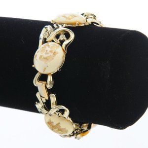BRACELET - Bright gold tone base, adorned with rhinestones is the setting for 6 creamy white Lucite with gold confetti cabochons. Each Lucite gem is 5/8 inches in diameter - the bracelet measures 7 1/2 inches flat and 7/8 inches wide. BG-004