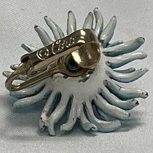 Coro Craft beautiful flower, blue, white, green, and gold brooch/pin, and clip earring. VGC. Enameled turquoise blue chrysanthemum flowers. Yellow-green leaves. Strong pin, and marked on the back. Pin: 2.5” x 2.25”. Earrings: 1” rounds.