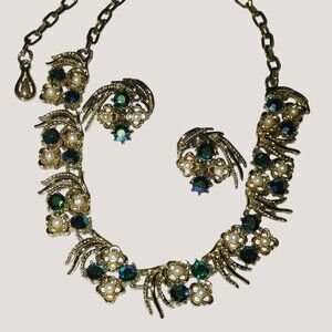 A timeless Coro jewelry set featuring a gold-tone necklace and matching clip-on earrings. Adorned with faux pearls and green rhinestones, this elegant set reflects mid-century design aesthetics. Ideal for collectors or as a statement addition to vintage-inspired outfits.