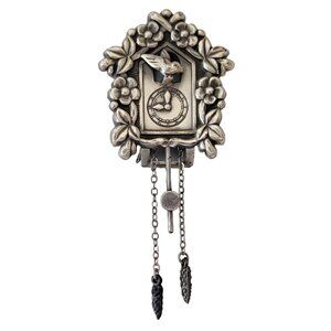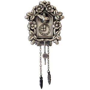 This remarkable Coro Pegasus Fur Clip is marked with the Pegasus stamp and was known to have been produced by Coro in the 1940s. It features a silver-tone Cuckoo Clock figural set at 9:00, the bird box is intricately designed with a floral motif and a bird coming out of the door. It has an articulated pendulum that swings back and forth when the mechanical chain is pulled. The cuckoo clock measures approximately 1.8 inches, with an overall length of 4 inches. The side of the clock's frame is stamped with Coro in script inside a rectangle with a Pegasus beside it. There are two prongs on the back of the birdbox which is the fur clip that opens and works smoothly and closes tightly.