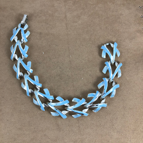 Vintage Signed Coro Pegasus Blue Linked Vines 7.25 inch Bracelet Soft Blue Enamel Vines beautiful Silver and Enamel work and is in great condition. No missing parts, great sparkle and shiny silver tone Over all is in excellent condition 1960's Coro on the Clasp 1/2 inch wide