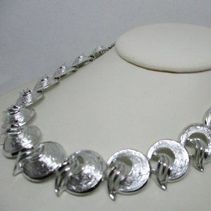 Never Worn Coro silver tone metal textured open circle shapes sections linked necklace with extension chain J clasp round end bead. This necklace is in perfect like new condition because it has not been worn. Total Length including J clasp and end bead 16 & 3/4 inches. Open circles section 11 & 1/8 inches. Width 3/4 inches.