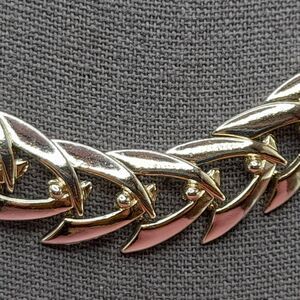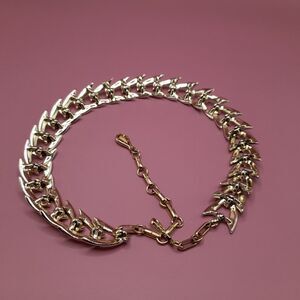 The "Coro" light gold-tone choker necklace is a vintage piece, likely from the mid-20th century. It features linked triangular or cone-shaped segments, creating a flexible chain that lies gracefully around the neck. The necklace typically has an adjustable length, ranging from approximately 16-17 inches, and is about 3/4 inches wide. It is made of a lightweight metal with a gold-tone finish. The "Coro" mark can be found on the clasp.