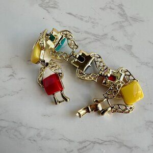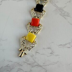 Brighten your vintage collection with this eye-catching signed Coro bracelet from the 1950s. Featuring bold thermoset lucite squares in vibrant shades of red, yellow, black, turquoise, and coral, it’s linked with openwork gold-tone settings in a striking mid-century design.