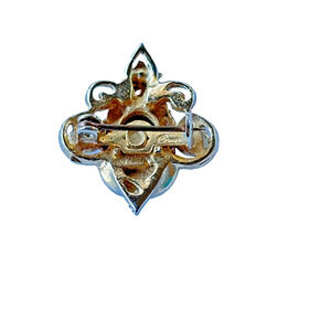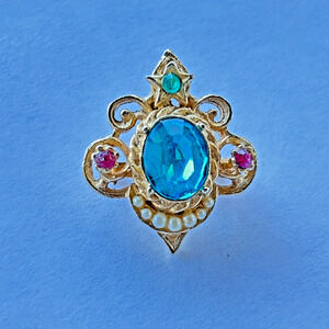 Vintage CORO Brooch / Pin, Goldtone with Turquoise Blue Rhinestone, small pearls and red. Small size measures approx. 1" x ¾". Condition is good, no missing stones...lovely piece, Retro, Mid Century