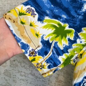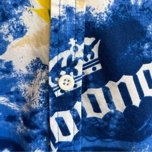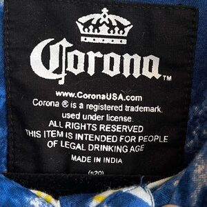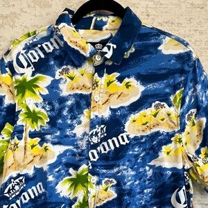 Corona Hawaiian Button Up Shirt Sz XL Blue Yellow Palm Trees Tropical Vacation