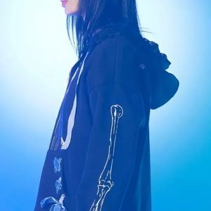 Keep yourself warm while practicing your vows in the forest! (Beware of ghostly branches.) This Corpse Bride hoodie features Emily and Victor printed on the front and bones down the sleeves. The movie title and butterflies are printed all over the back. Comes with blue velvet lace-up details at the pockets and matching drawstring cords, plus black lace detailing around the hood and waist hemline.