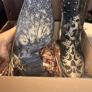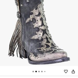 Elegant Corral booties with intricate black and cream patterns. Features decorative studs and fringe details.