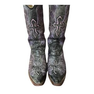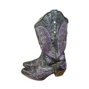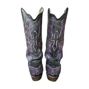 Corral Boots A1969 women’s size 8M with inlaid purple cross and wings. These are vintage western cowboy boots.