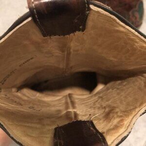 Item: Western cowboy boots with teal/green fleur de lis cutout inlays and embroidery
