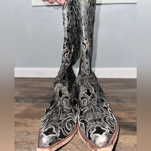 Tinting, abrasions, and scarring on leather add vintage cowboy boot character