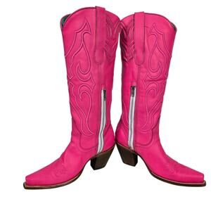 Get ready to turn heads with these sensational Corral handcrafted boots. These aren't just boots, they're a vibe. Crafted with beautiful leather in a vibrant, unmistakable neon pink fuchsia and featuring classic Western flame-style stitching. Ankle zipper closures. Perfect for concerts, festivals, or just adding a serious pop of color to your everyday look!