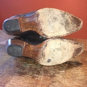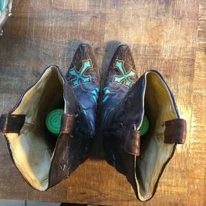 This is a pair of Corral Saddle Rose Western Boots in color Antique Brown/ Turquoise. Womens size 10 M. Rose and cross inlays in leather. 2.25" stacked heel. 13" Shaft. Pointed toe. Condition as seen in pictures.
