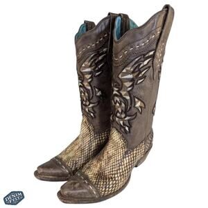 Step into standout Western style with these stunning Corral boots! Featuring a rich brown leather shaft with intricate embroidery and a striking tan exotic-print foot, these boots blend craftsmanship and bold design. Perfect for rodeos, concerts, or everyday wear.