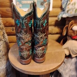 Stylish cowboy boots with teal cross patterns. Perfect for a Western look.