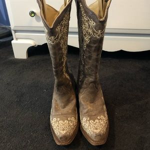 Beautiful floral design Corral boots, worn maybe 10 times max! Just didn’t have anything to wear them with! Just a little scruff on the tip of the toes!