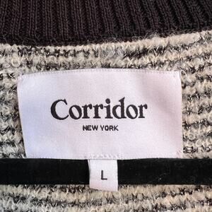 Corridor Men's optic alpaca cardigan. Crafted in a optic black and white checkered pattern, this cardigan is finished with classic horn buttons. Black trim. Front pockets. Metallic yarns throughout. Ultra soft. In excellent condition. Size large - 25" pit to pit; 30.5" length; 28" sleeves.