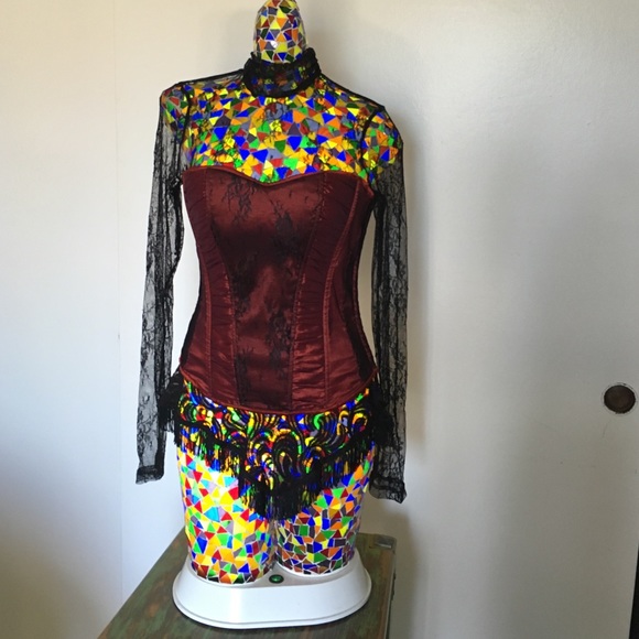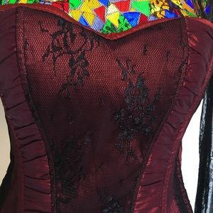 Steampunk burgundy brocade corset with black lace long sleeves and black fringe embellishments. Laces up the back