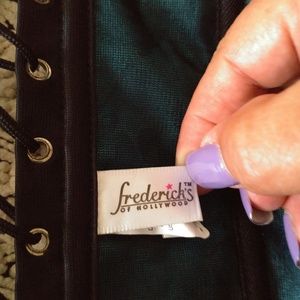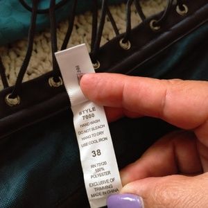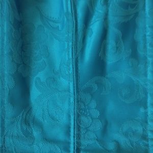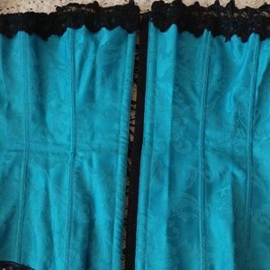Strapless teal blue corset Trend with black lace on top black trim on bottom. Bronx close in the front from top to bottom. Embroidered floral prints ties in the back. Plastic boning inserts. Size 38