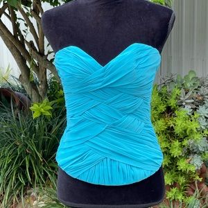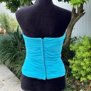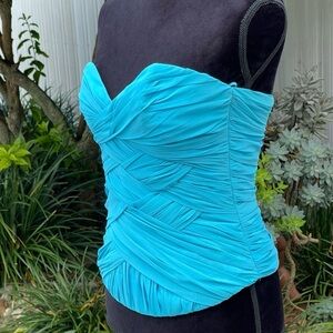 This is a turquoise strapless ruched chiffon corset top. waist 28’ inch, bust 32’ inch.