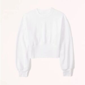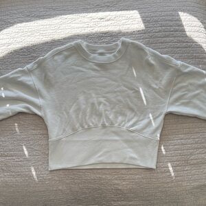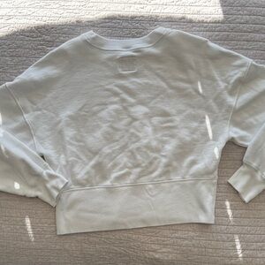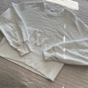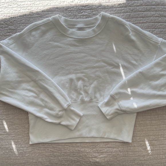This top has the perfect cropped length that is flattering without being too short. The bottom has a ribbed corset style detail that creates a really nice silhouette while still feeling like a comfortable classic crewneck sweater.