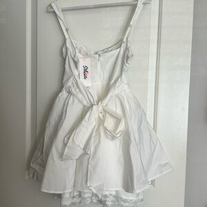 Elevate your style with this stunning, pre-loved mini-dress. Featuring a vibrant white satin-like fabric with a chic, neckline and delicate spaghetti straps. The structured bodice with corset-style seaming leads to a playful, flared mini-skirt finished with a charming ruffle hem. A perfect piece for a party, special event, or a night out.