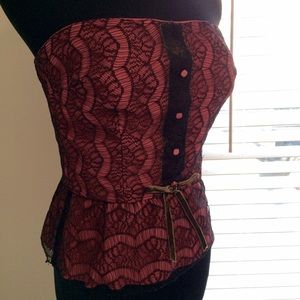 Corset style peplum top by designer Corey Lynn Calter. Neon pink with black lace overlay. Green velvet accents and bow. 4 iridescent pink faux buttons. Back closes with 13 hook and loop closures. Overall length is 15.5". Excellent condition!
