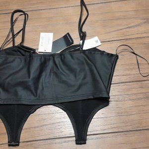 soft faux leather material. Features adjustable straps, front hook eye detail, beautiful paneling. Provides great cup support, has padding.