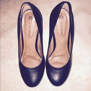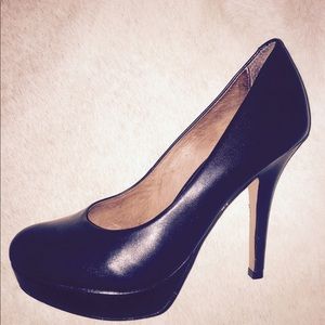 A hidden platform, leather pump in a classic silhouette. Ample padding in shoe.