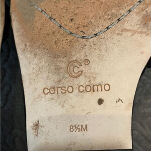These Corso Como flats showcase a sleek black design with a pointed toe and a charming bow detail. The soft fabric offers a subtle sheen, adding a touch of elegance to any ensemble. Ideal for both casual and formal settings, these flats combine comfort with style.