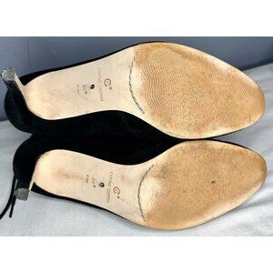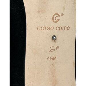 The Corso Como Myer ankle bootie is a stylish and unique footwear choice for women in size 9.5 featuring a black suede leather construction with an almond toe shape and stiletto heel design. This bootie is adorned with an adjustable tie closure, making it a fashionable and versatile option for fall, winter, and spring seasons. With a dark romantic fairy grunge artsy theme, this limited edition Italian-made bootie is lightweight, breathable, and comfortable with a leather lining and insole, perfect for adding a touch of whimsical flair to any outfit.