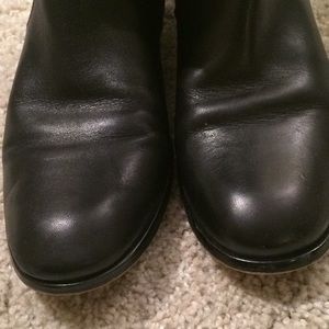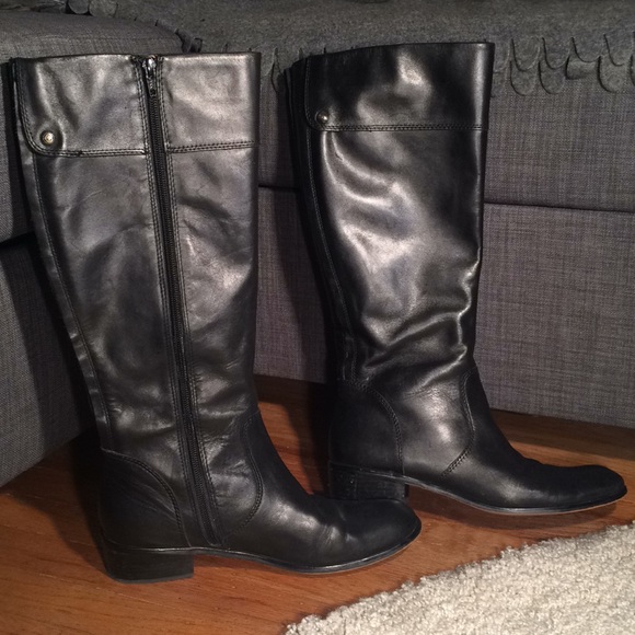 Soft black Italian leather riding boots in fantastic condition. 1” heel on a wooden sole with a 15” circumference on the calf as well as shaft height. Officially sized as an 8M.
