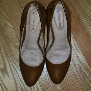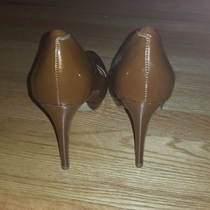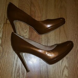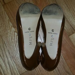 "Luggage" colored patent leather Corso Como pumps. The color is like a deep copper. The heel is 4" and the playform goes from .5" at front to .75" back if platform. I wore these once. In great condition.