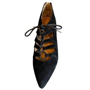 Gorgeous Corso Como suede Victorian lace up Lady Heels in Black, size 7.5. Good preowned condition, zipper back entry for easy on and off, comfort footbed 3.5” stiletto heel