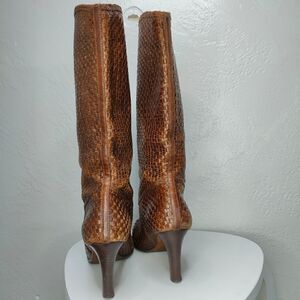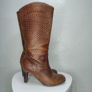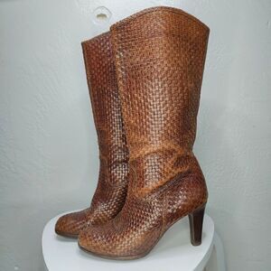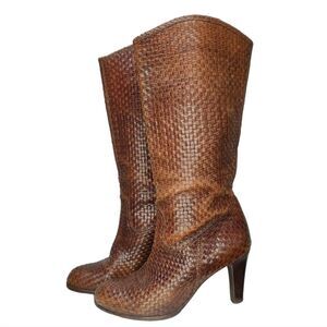 woven leather vintage conac brown boots fall winter heels quality cottage Cottagecore boho Bohemian hippie coastal shabby chic Farmhouse casual comfortable comfort weave textured