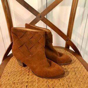 Gently worn booties in beautiful warm brown color with 2” heel and unique weaving detail at ankle.
