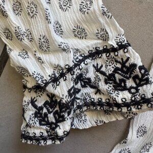 Beautiful long-sleeve boho-style blouse featuring detailed black embroidery, scoop neckline with tie and tassels. White base with black geometric pattern. Lightweight and breathable fabric β perfect for spring and summer.