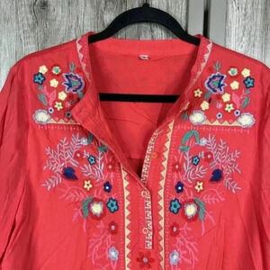 Coruja Embroidered Top Tunic Red Color 3/4 Sleeves Popover Scalloped Hem Sz M