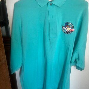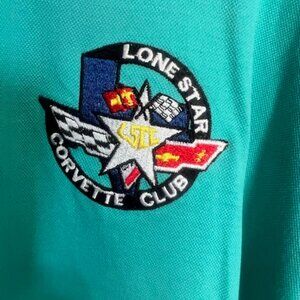 Turquoise short sleeved polo shirt with embroidery stitching for those car collectors! Race car corvette action on your shirt now :)