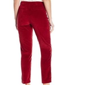 Corynna Velvet Ankle Pant in poinsettia red, This classic fit can do no wrong. The easy, figure-elongating construction of NYDJ Corynna Ankle Pants pairs well with everything, thanks to a flattering waist and a versatile, knee-to-hem, straight-leg fit. Our Lift Tuck® Technology a proprietary slimming panel with a patented design to shape you. Perfect for the upcoming holidays and ooks amazing with heels and boots! 28" inseam, 10" rise, 16" across waist, 7" across hem.