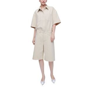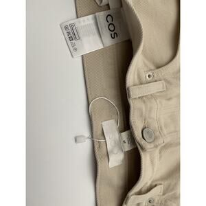 Cos Longline Beige Cotton Denim Shorts Size 29: relaxed fit, button and zip closure, measurements: 17.5 inch width x 11.5 inch length.
