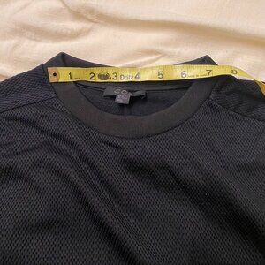 Black crewneck sweater with 1 adjustable zipper along the side bottom. Versatile sweater, timeless black hue, and the sweater is sheer by design. Cleaning husband's closet and finding clothes he does not wear.
