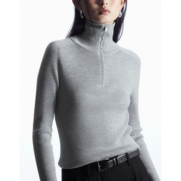 Cos Ribbed Wool Gray Half-Zip Top Size S: half-zip, slim fit, regular length, long sleeve, turtleneck.