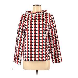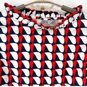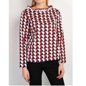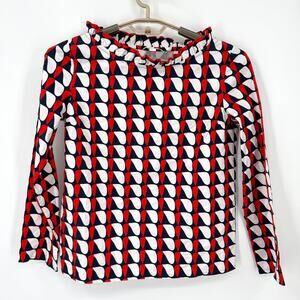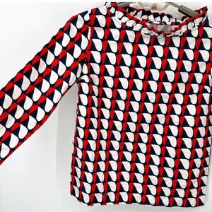 Gorgeous, 100% cotton long sleeve blouse with a wider neckline accented with a ruffle. Blue white and red GEN metric shaped print. Size 6 it is new without tags. Laid flat major approximately 19 inches armpit to armpit and the length from the top of the shoulder down the back is 23 inches.