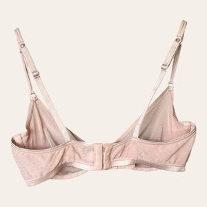 Nude mesh bra from the brand Cosabella. The style is “Soire Confidence” and I believe the color is Mandorla but I could be wrong! It’s a light skintone cream/beige color with a slight pinkish tint. First two pictures (with cream background) were taken in direct bright light, others (with red background) in dimmer indirect lighting. Size 34C.